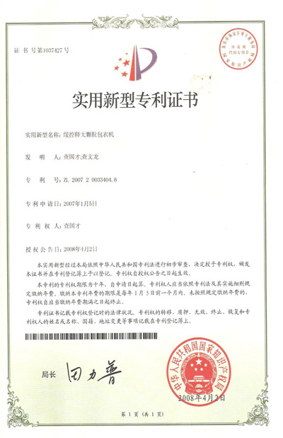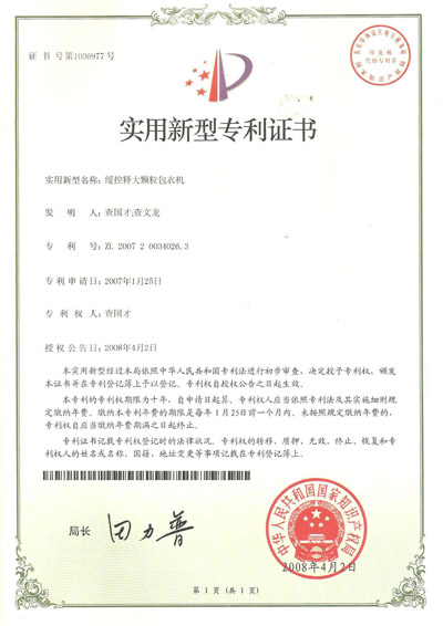 認(rèn)證簡介:緩控釋大顆粒包衣機(jī)實用新型專利證書