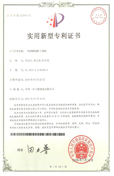 認(rèn)證簡介:一種沸騰制粒干燥機(jī)實用新型專利證書