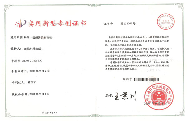 認(rèn)證簡介:防爆沸騰制粒機(jī)實用新型專利證書