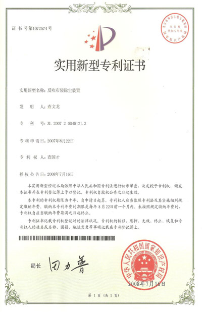 認(rèn)證簡介:反吹布袋除塵裝置實用新型專利證書