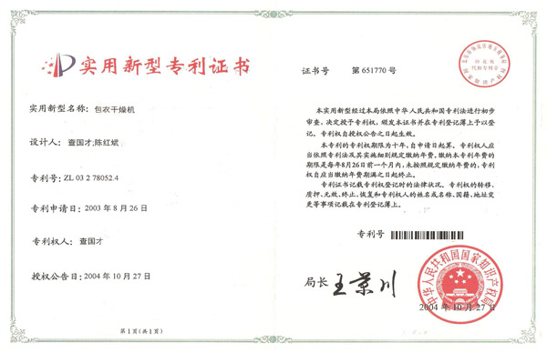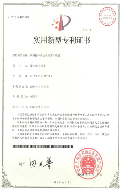 認(rèn)證簡介:閉路循環(huán)離心式噴霧干燥機(jī)實用新型專利證書