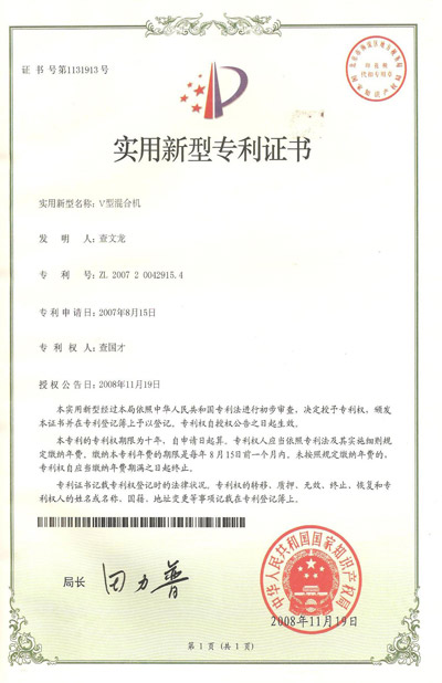 認(rèn)證簡介:V型混合機(jī)實用新型專利證書