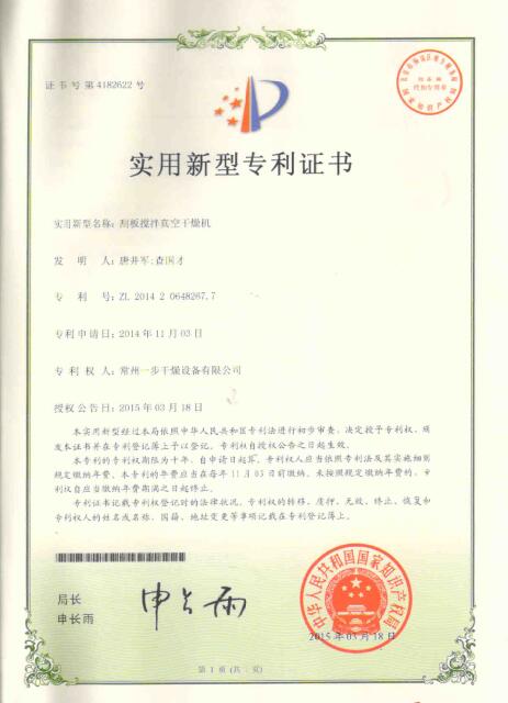 認(rèn)證簡介:刮板攪拌真空干燥機(jī)實用新型專利證書
