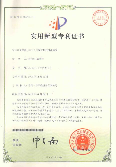 認(rèn)證簡介:用于干法制粒機(jī)的擠壓裝置實用新型專利證書