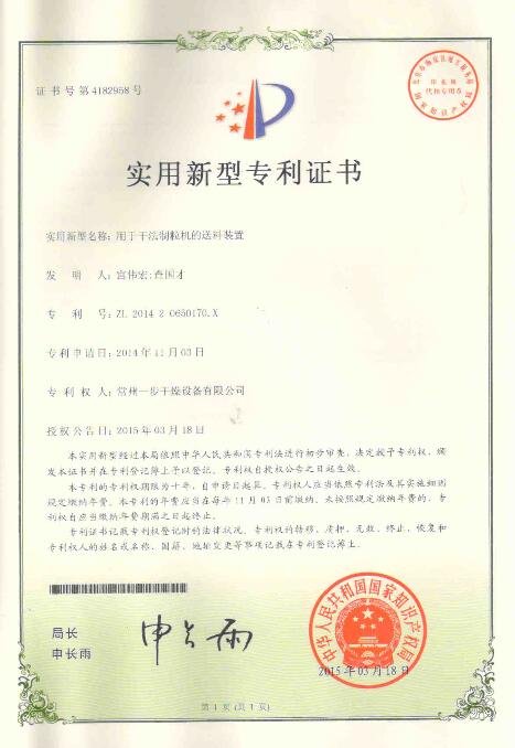 認(rèn)證簡介:用于干法制粒機(jī)的送料裝置實用新型專利證書