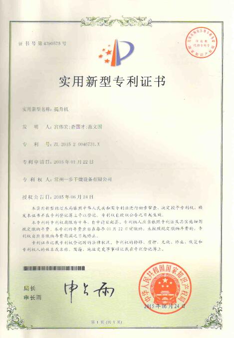 提升機(jī)實用新型專利證書
