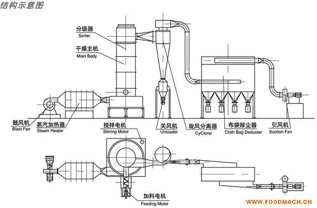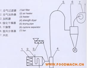 廠家供應(yīng)氣流干燥機組,使其瞬間得到干燥,干燥的淀粉經(jīng)旋風(fēng)分離器、關(guān)風(fēng)器排出,廢氣經(jīng)風(fēng)機排入大氣。