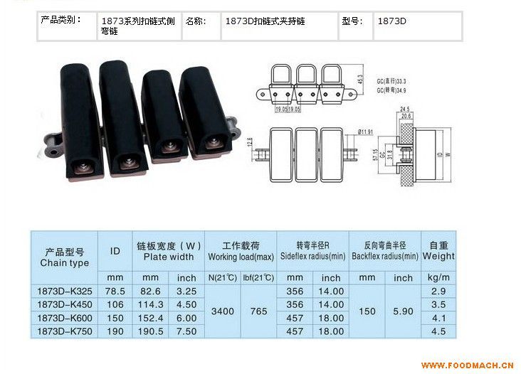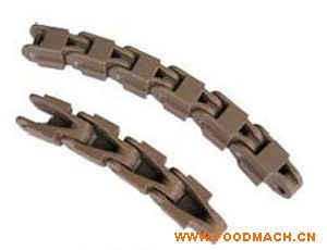 1873D扣鏈式夾持輸送鏈;寬度(mm)82.6、114.3、152.4、190.5,節(jié)距38.1mm,低鏈201或304不銹鋼鏈條,傳動鏈設計有低鏈扣住塑料...