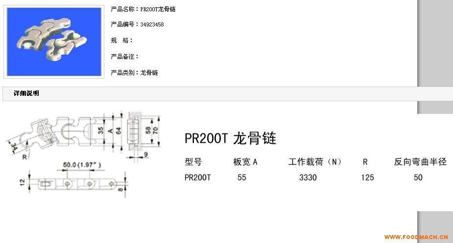 1701龍骨鏈;寬度52mm,節(jié)距50mm,厚度25mm,工作載荷2669N(21℃),轉彎半徑150mm,軸心為不銹鋼連接,1米=20片;