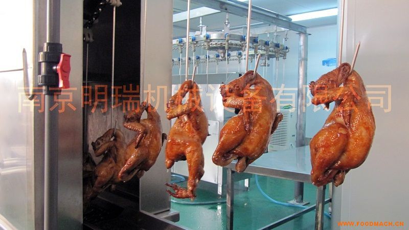鴨坯的前處理、晾掛、著色、烤制、冷卻及包裝,全程工藝的自動化加工流水線,主要用于烤鴨、烤鵝或其他烤禽的加工。加工量:1...