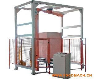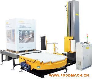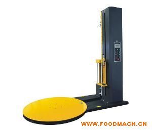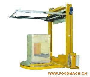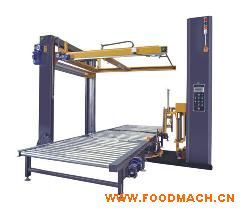 全自動纏繞覆頂機裝有自動上、斷、粘膜機構(gòu)及遙控裝置,操作人員可于叉車上或遠(yuǎn)程控制自動運行,實現(xiàn)垛型的四周纏膜及頂部覆膜。