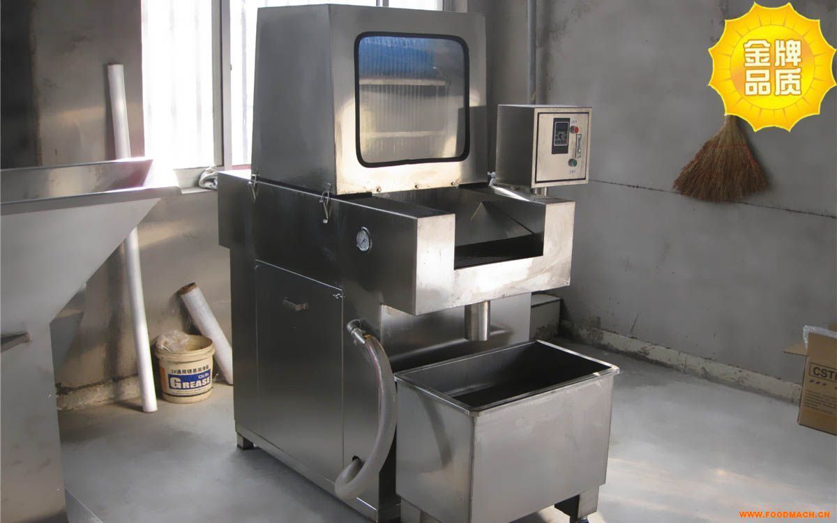 全自動(dòng)鹽水注射機(jī)是將鹽水注入肉中充分腌漬,注入配制的水溶液的肉塊能使肉質(zhì)嫩化,松軟,提高了肉制品的品位和出品率。