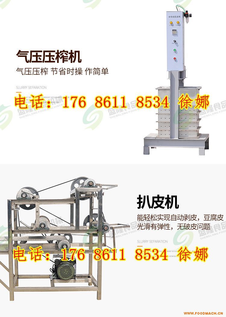 豆腐皮機,潑皮、壓榨、剝皮全自動操作具有攪拌潑腦、傳送折疊、壓制卷布、自動壓榨、自動剝皮等流水作業(yè)功能,*的刮腦器,可...