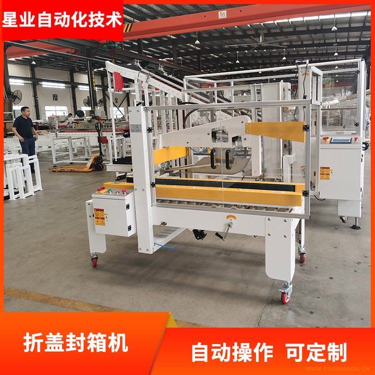 折蓋封箱機(jī)可自動完成紙箱上部折頁的自動折合,根據(jù)需要可完成上部膠帶或上下膠帶的自動粘貼,無需人手作業(yè);操作簡單、使用...