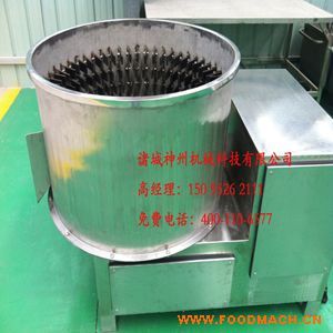 該機(jī)用于豬蹄、豬耳、豬鼻等去毛后的去黃皮、黑皮工作和去除附著在表面余毛雜物等工作。本機(jī)通過(guò)減速機(jī)帶動(dòng)甩盤轉(zhuǎn)動(dòng),使物料在筒內(nèi)高速旋轉(zhuǎn)碰撞、摩擦,從而實(shí)現(xiàn)脫黑皮和打毛的要求。