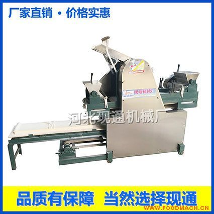 (5) 調(diào)試滾筒前先把調(diào)整滾筒的手柄調(diào)到*緊,做上記號(hào),同時(shí)松手柄,這樣厚薄就會(huì)一致。然后把和好的面絮放在進(jìn)料口,不要用手指向滾筒里推面,要用掌心,避免把手指壓近滾筒造成傷害,根據(jù)您的需要反復(fù)把面皮壓成形,再用木軸卷起來,然后放到機(jī)器的進(jìn)料口,把滾筒調(diào)試您需要的厚度,就可做出光滑的面皮,再經(jīng)過輸送帶傳送,打開粉箱離合器自動(dòng)撒上淀粉或面粉,有輸送帶把撒完粉的面皮自動(dòng)帶到折疊的機(jī)架上,由自動(dòng)折疊裝置自動(dòng)把面皮折疊起來。做餃子皮用模具扣,做餛飩皮用刀切,裝上面條刀可做出粗細(xì)不等的鮮面條。