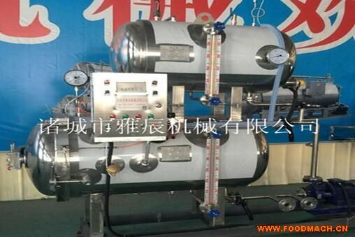 電加熱水浴殺菌鍋在熱水池內(nèi)用蒸汽將水溫升至沸騰,啟動(dòng)水泵用大口徑流量管道把熱水抽到鍋內(nèi)進(jìn)行直接殺菌。在熱水達(dá)到一定水位時(shí),隨即啟動(dòng)熱水循環(huán)泵,把鍋內(nèi)熱水進(jìn)行循環(huán),采用三點(diǎn)出水八點(diǎn)進(jìn)水的方式,在循環(huán)時(shí),為了確保鍋內(nèi)出水點(diǎn)的均勻,采用了三點(diǎn)串聯(lián)式.循環(huán)水經(jīng)水汽交換消音器快速升溫(用此水汽交換消音器,避免在鍋內(nèi)加溫時(shí),蒸汽和貨物的直接接觸,使部分貨物溫度偏高),再通過(guò)鍋內(nèi)八個(gè)進(jìn)水點(diǎn)(上、下、左、右各兩點(diǎn)),使熱水直接達(dá)到殺菌鍋內(nèi)進(jìn)行循環(huán).在鍋內(nèi)熱水進(jìn)行循環(huán)的同時(shí),蒸汽角座閥自動(dòng)開(kāi)啟進(jìn)行鍋內(nèi)升溫,在即將達(dá)到溫度時(shí),通過(guò)溫度變送器準(zhǔn)確的把鍋內(nèi)溫度輸送到溫控儀,控制蒸汽角座閥進(jìn)行溫度調(diào)節(jié),此調(diào)節(jié)閥是根據(jù)鍋內(nèi)溫度的升降進(jìn)行逐步調(diào)節(jié),以防止鍋內(nèi)到達(dá)溫度時(shí),溫度反沖。在達(dá)到設(shè)定溫度的同時(shí),關(guān)閉蒸汽角座閥門,進(jìn)入產(chǎn)品殺菌階段(不同產(chǎn)品殺菌時(shí)間可調(diào))。在到達(dá)殺菌時(shí)間后,報(bào)警器報(bào)警,打開(kāi)出水閥及水泵,把鍋內(nèi)熱水用水泵輸送到熱水池,下一鍋殺菌時(shí)循環(huán)使用。
