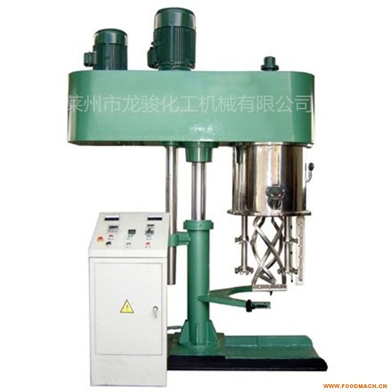 雙行星動(dòng)力混合機(jī)上裝有低速攪拌部件和高速分散部件。低速攪拌部件采用行星齒輪傳動(dòng),攪拌槳在公轉(zhuǎn)時(shí)也自轉(zhuǎn),使物料上下及四周運(yùn)動(dòng),從而在較短的時(shí)間內(nèi)達(dá)到理想的混合效果。高速分散部件與行星架一起公轉(zhuǎn),同時(shí)高速自轉(zhuǎn),使物料受到強(qiáng)烈的剪切與分散混合,其效果為普通混合機(jī)的幾倍。分散部件分單分散軸和雙分散軸,客戶可根據(jù)需要選用; 釜內(nèi)低速攪拌槳與高速分散頭的轉(zhuǎn)速均采用變頻調(diào)速,可根據(jù)不用工藝不同粘度選擇不同的轉(zhuǎn)速。