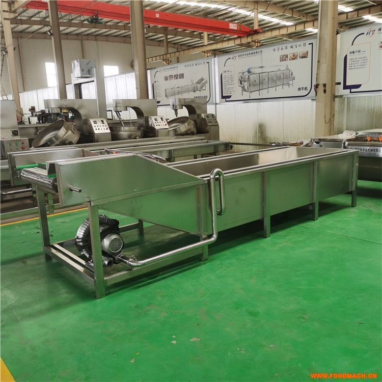 該蔬菜清洗流水線采用水浴式氣泡清洗,物料在水中通過氣泡在釋放過程中產(chǎn)生的翻騰效果,使物料在水中發(fā)生不規(guī)則的強烈翻轉(zhuǎn)運動,通過物料的運動有效分離被清洗物表面附著物,模擬人工清洗基本動作,同時由于物料是在汽水混合物中產(chǎn)生的翻騰運動,有效避免了清洗過程中產(chǎn)生的碰、磕、劃傷等對物料的損傷現(xiàn)象,提高了工作效率,變?nèi)斯ぷ鳂I(yè)為機械化加工。