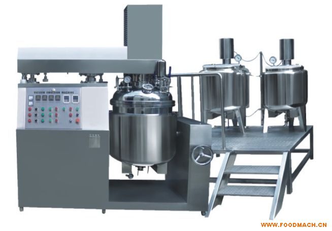 本機(jī)組采用上部同軸三重型攪拌器,液壓升降開(kāi)蓋,快速均質(zhì)攪拌器轉(zhuǎn)速:0-3500r/min(變頻調(diào)速)、慢速刮壁攪拌器轉(zhuǎn)速:10-100r/min(變頻調(diào)速)、均質(zhì)頭采用高剪切渦流式乳化攪拌機(jī),慢速刮壁攪拌器自動(dòng)緊貼鍋底及鍋壁。采用真空吸料,特別對(duì)粉體物料利用真空吸入避免了粉塵飛揚(yáng)。整個(gè)工序在真空條件下進(jìn)行,防止物料在高速攪拌后產(chǎn)生汽泡,能夠達(dá)到衛(wèi)生無(wú)菌要求。