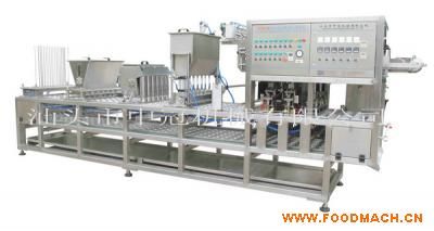 CFD-6型八寶粥自動(dòng)灌裝封口機(jī)功能:自動(dòng)送杯→自動(dòng)灌裝糧食干料→自動(dòng)下大顆粒物料(如蓮子或花生等)→自動(dòng)灌裝湯水→自動(dòng)打生產(chǎn)日期→自動(dòng)光標(biāo)較正→自動(dòng)封口→自動(dòng)剪切→自動(dòng)退杯和清洗→自動(dòng)收邊角膜。