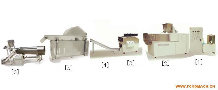 該生產(chǎn)線以面粉,大米粉及玉米粉為主要原料,采用擠壓成型技術(shù)輔以形狀各異的擠出模具擠出成型,再經(jīng)油炸,調(diào)味制成“鍋巴”、“枕包“、“比薩卷”、“貝殼酥”、“銀耳酥”、“貓耳酥”、“豌豆脆”、“田螺”、”三角”等多種形狀及口味的油炸面食食品。產(chǎn)品造型逼真、組織細(xì)膩、口感酥脆。擠出成型的制品可直接油炸,無需烘干。生產(chǎn)工藝簡單、設(shè)備投資小,是中小型企業(yè)的理想選擇。