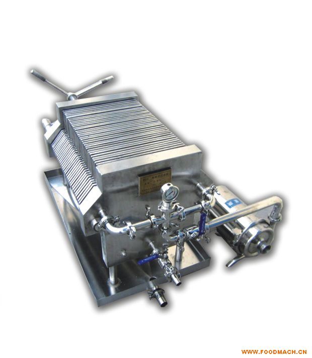 板式過濾器為不銹鋼多層板框壓濾機,適用于濃度50%以下粘度較低,含渣量較少的液體作密閉過濾以達到提純,滅菌、澄清等精濾、脫活性碳、除微粒、半精濾的要求,直接選用微孔濾膜,可不經微孔薄膜過濾器過濾可達到無菌過濾之目的)。本機過濾面積大,流量大,適用范圍大,所以在制藥、化工、食品等行業(yè)有廣泛用途,應用在制藥廠針劑藥液之過濾,效果甚佳。