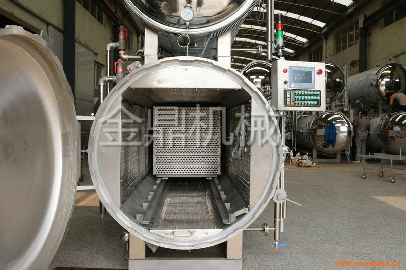 主要特點:全自動PLC*控制全水浸泡式殺菌,*控制溫度和壓力。兩臺殺菌釜交替使用同一批殺菌水交替工作,一臺的食品處理完后,直接將高溫處理水注入到另一臺中,減少處理水和熱量的損耗。
