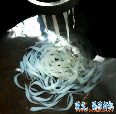 制作漏魚有多種方法,可以用淀粉或面粉加水調(diào)成漿加工,也可以把大米浸泡磨漿后加工。水漿進入機器內(nèi)通過電加熱電子自動控溫水浴煮漿熟化,然后通過模具,進入冷水中,成型的漏魚象無數(shù)條銀魚或蝦在水中游動,煞是好看。