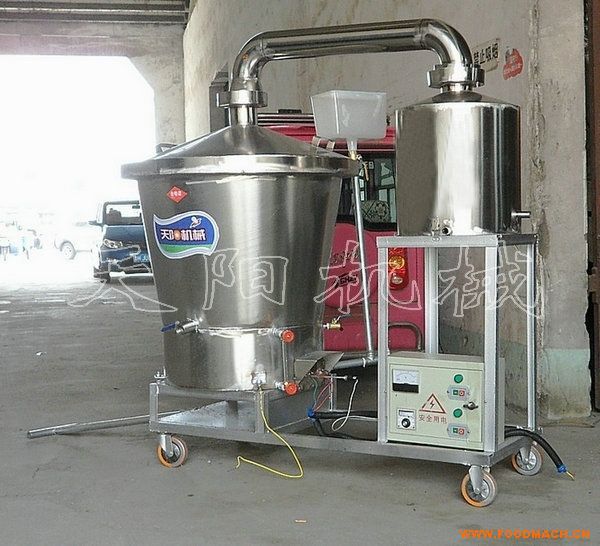 電氣兩用蒸酒設(shè)備結(jié)構(gòu)新穎,使用方便,安全可靠,綠色環(huán)保,是天陽公司為門市用戶和流動加工戶設(shè)計生產(chǎn)的,適合家庭作坊,集貿(mào)市場進(jìn)行糧食酒蒸餾的小型白酒設(shè)備,由加熱裝置,蒸鍋,蒸汽水箱,導(dǎo)氣管、冷卻器和移動車組成,蒸鍋及冷卻器均采用優(yōu)質(zhì)不銹鋼材料焊接,不會產(chǎn)生對人體有害的鉛、鋁等物質(zhì),耐酸堿腐蝕。蒸鍋為雙層鍋,采用電熱管電子自動控溫裝置或煤氣裝置加熱,蒸酒溫度不忽高忽低,料液無需攪拌,上汽均勻,不焦鍋。冷卻器采用陣式列管套管冷卻,酒蒸汽與冷卻水接觸面積大,冷卻效果好,產(chǎn)酒率高,每百斤原料可以蒸餾出50度的玉米酒60斤,高粱酒50斤,大米酒80斤左右,所蒸白酒酒質(zhì)純正,酒香醇厚,燒酒后的糟液富含蛋白質(zhì)等營養(yǎng)物質(zhì),用于催肥養(yǎng)殖效果很好。