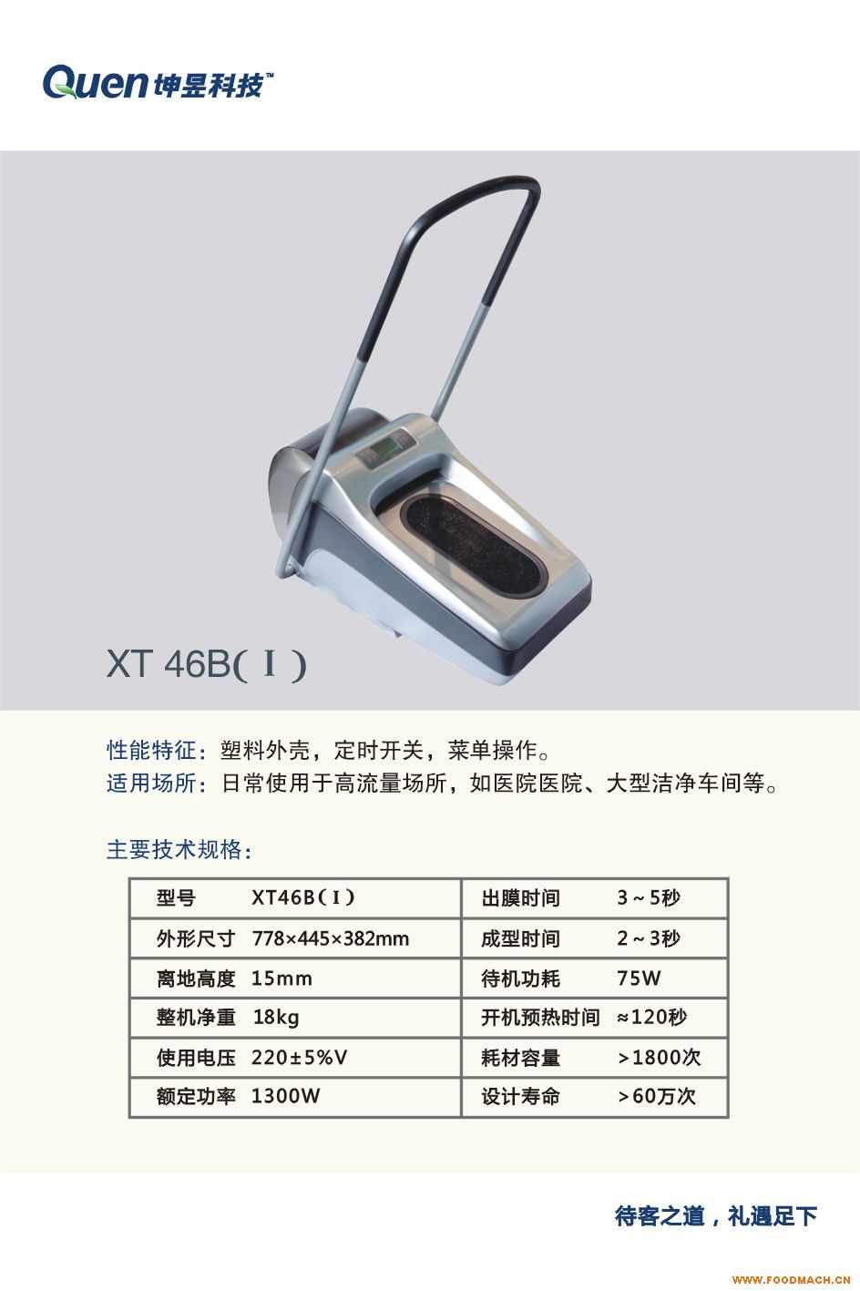 技術(shù)規(guī)格XT-46BI 使用次數(shù)60萬次 PVC耗材容量1800只 電壓230V5 使用功率1300W 開機預熱時間120秒 待機功耗75W 出膜時間2-3秒 覆膜耗時2-3秒