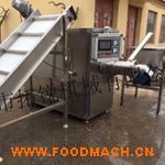 利用滾動的采肉桶和傳動的橡膠帶的相互壓榨運動將魚肉從采肉滾筒上的網(wǎng)眼擠入采肉桶內(nèi),而把魚皮、魚骨留在采肉桶外,并由采肉滾筒外部刮刀將魚骨和魚皮刮落,達到魚肉和魚骨魚皮分離的效果。采肉帶和滾筒間隙越小,擠壓力度越大,采肉就越干凈?蛇m用于海魚、淡水魚、泥鰍以及各種魚類魚糜的采集,制作各式各樣的魚糜制品。