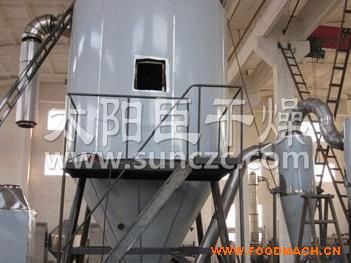 空氣經過濾和加熱,進入干燥器頂部空氣分配器,熱空氣呈螺旋狀均勻地進入干燥室。料液經塔體頂部的高速離心霧化器,(旋轉)噴霧成極細微的霧狀液珠,與熱空氣并流接觸在極短的時間內可干燥為成品。成品連續(xù)地由干燥塔底部和旋風分離器中輸出,廢氣由風機排空。