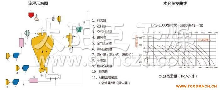 空氣經(jīng)過濾和加熱,進(jìn)入干燥器頂部空氣分配器,熱空氣呈螺旋狀均勻地進(jìn)入干燥室。料液經(jīng)塔體頂部的高速離心霧化器,(旋轉(zhuǎn))噴霧成極細(xì)微的霧狀液珠,與熱空氣并流接觸在極短的時(shí)間內(nèi)可干燥為成品。成品連續(xù)地由干燥塔底部和旋風(fēng)分離器中輸出,廢氣由風(fēng)機(jī)排空。